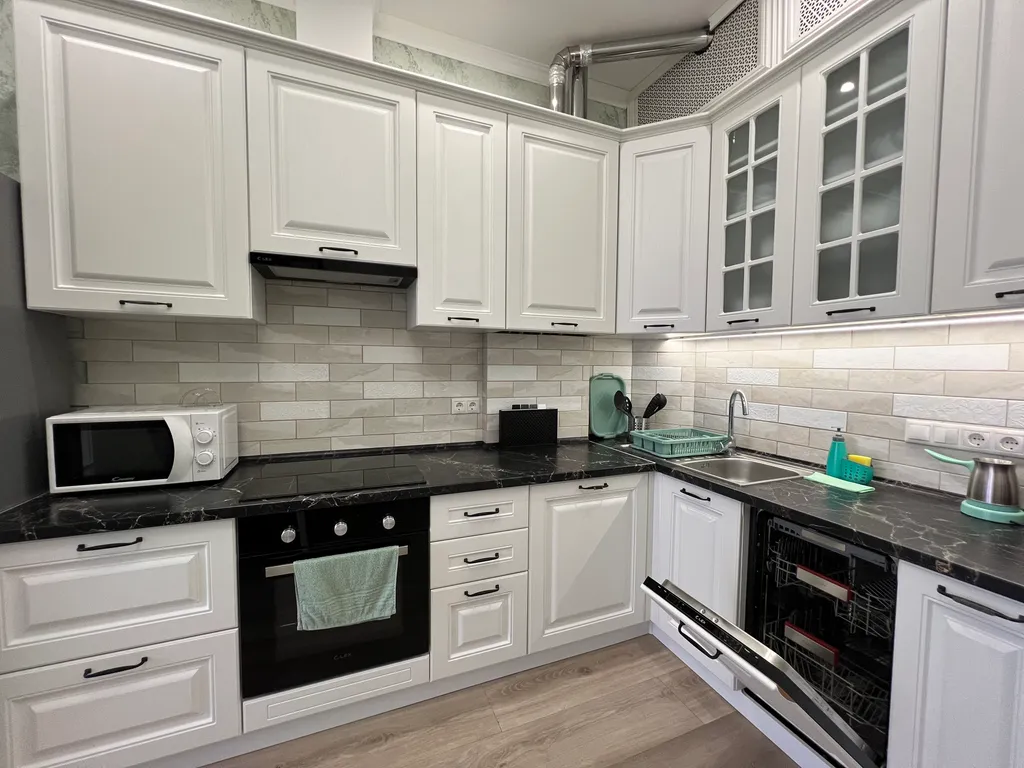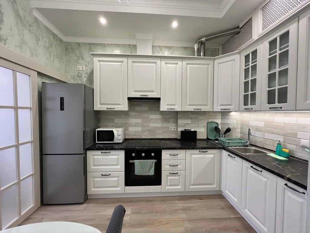 Чудесная светлая квартира с новым дизайнерским ремонтом, для семьи из 4 человек, с 2 раздельными спальнями. Балкон выходит на уровне 2 этажа вид на аллею.