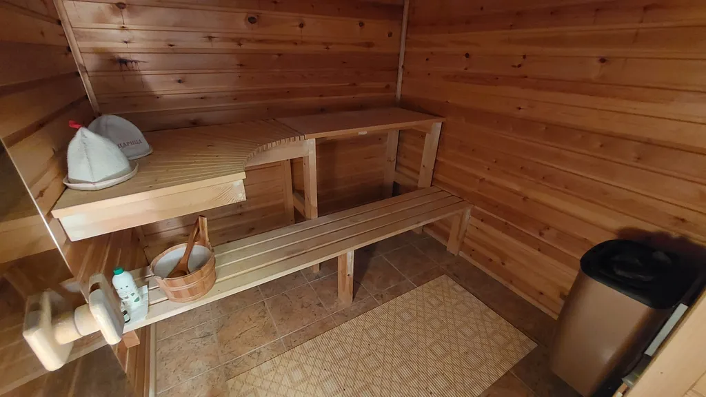 В доме имеется две большие кровати, три раскладных дивана, кухня-столовая, гостиная, два туалета (на разных этажах), душевая на два душа. К Вашим услугам предоставляется: полотенца, отглаженное постельное бельё, два телевизора с кабельным ТВ, в кухне много посуды, плита, духовка, микроволновка, чайник, кофеварка, тостер, посудомойка, холодильник, так же имеется стиральная машина, гладильная доска с утюгом, фен. В доме есть сауна (в стоимость не входит и оплачивается отдельно).