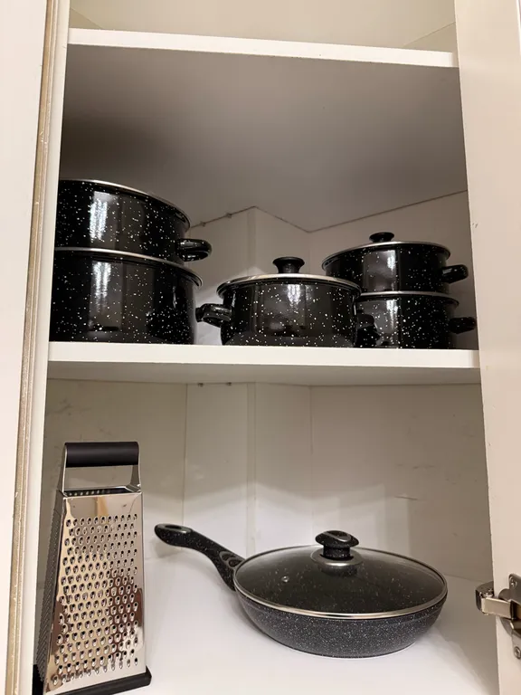 2. Кухня: полный набор посуды, кастрюли, сковородка, чайник, разделочные доски, ножи — всё новое.