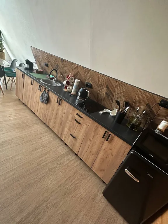 Гостиная с кухонным гарнитуром, обеденной зоной, проектором, раздвижной диван 160*200.