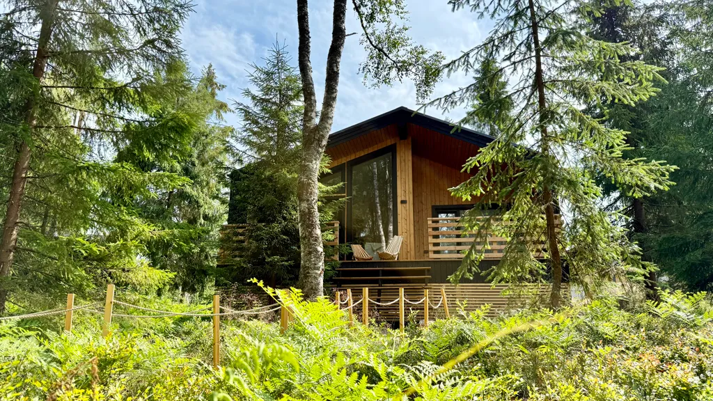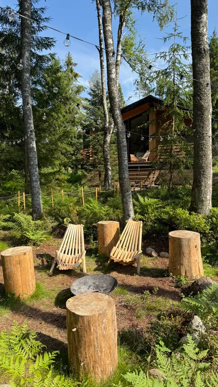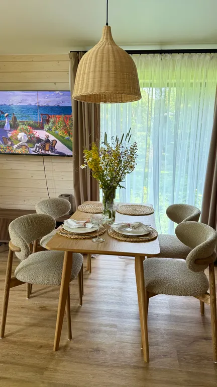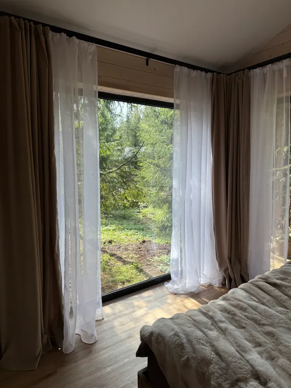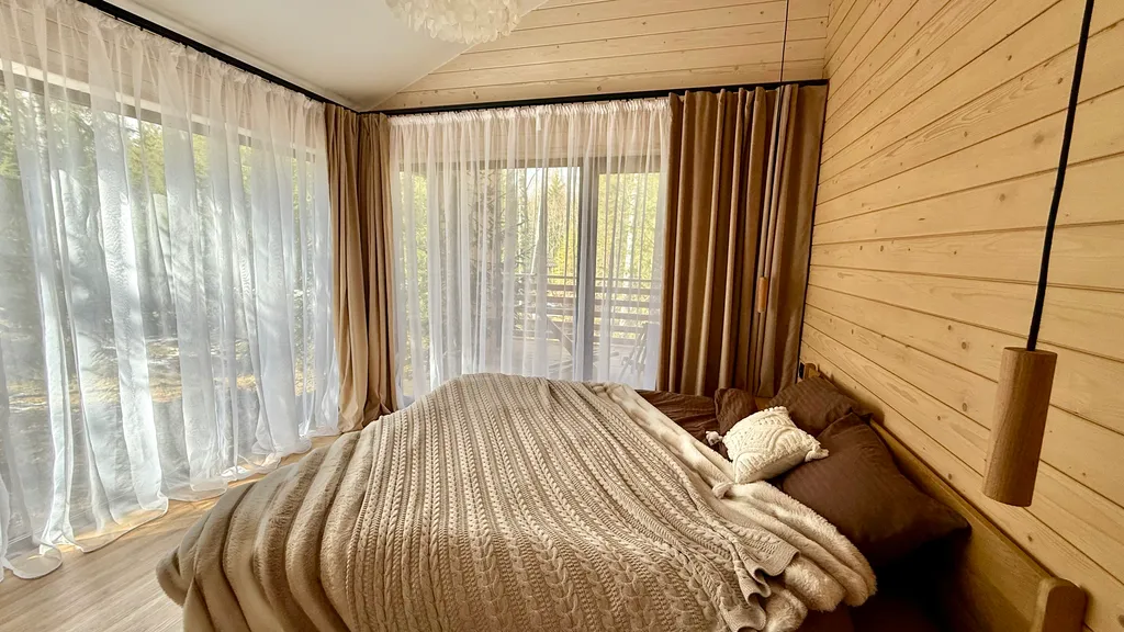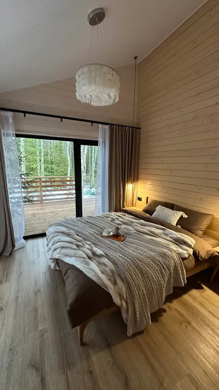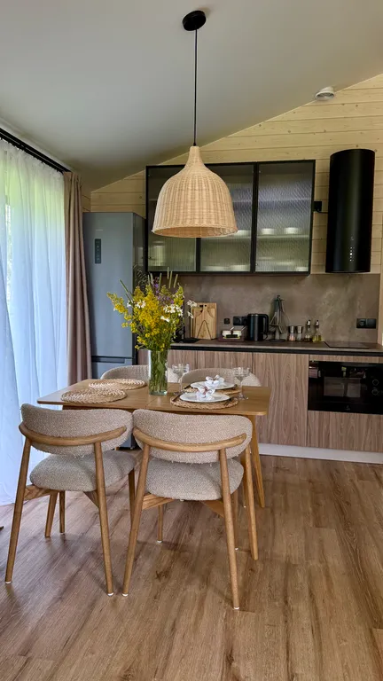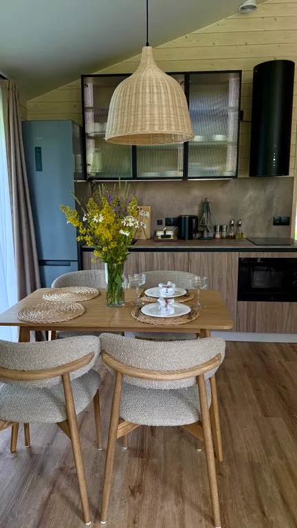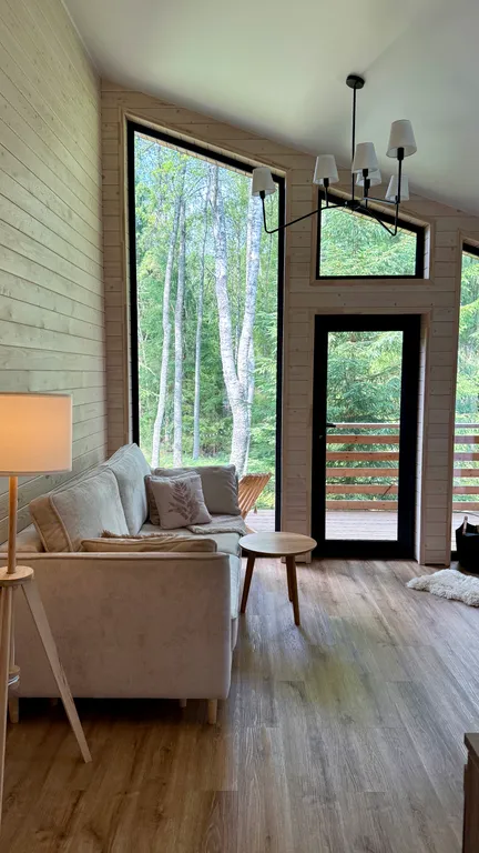 Просторная кухня-гостиная с панорамными окнами и шикарным видом на лес, камином, в котором очень красиво горит огонь (вы сможете убедиться сами). В гостиной есть двуспальный диван, можно разместиться и засыпать под тепло и трескание камина.