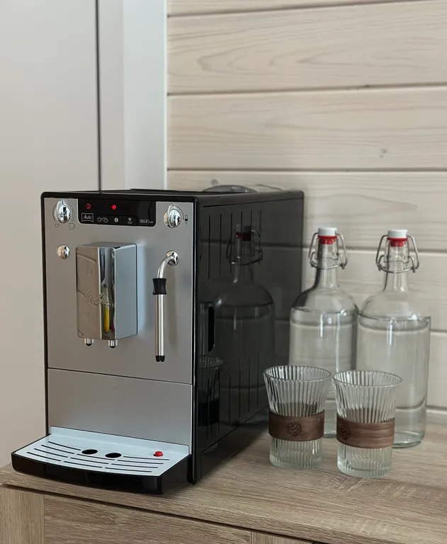 Кухня оборудована красивой посудой, холодильником, чайником, зерновой кофеваркой, микроволновкой, варочной поверхностью, есть посудомоечная и стиральная машина.
