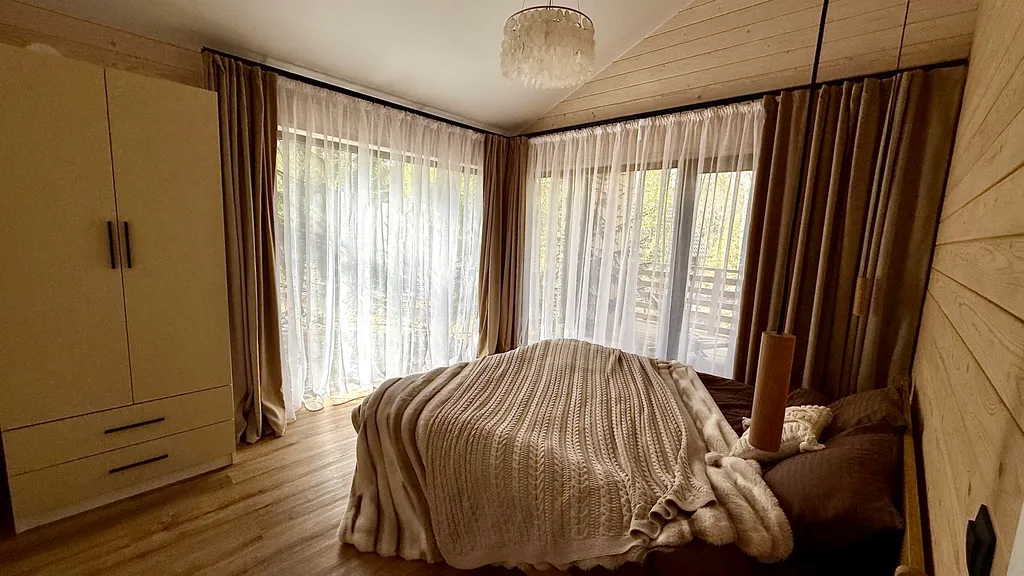 Спальня с двуспальной кроватью и шкафом для размещения вещей. В спальне панорамные окна на две стороны, чтобы наслаждаться чудесным видом.