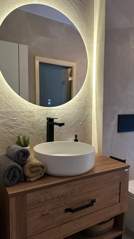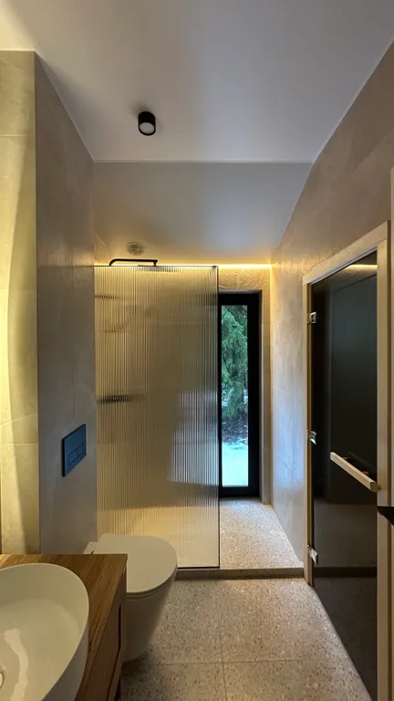 В доме водяные тёплые полы по всему контуру, даже в душе, поэтому будет тепло.