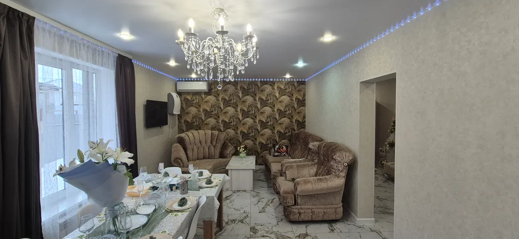 В гостиной новая посуда, чайник, вся необходимая техника с большим холодильником, индукционной плитой, духовым шкафом и т. Д., зоной отдыха, сервировка стола в подарок.