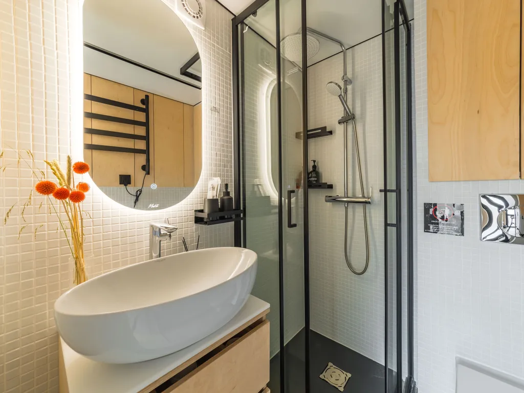 санузел, небольшая душевая кабина, шампунь, гель для душа, зубные наборы, полотенца и тапочки