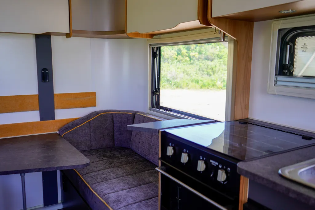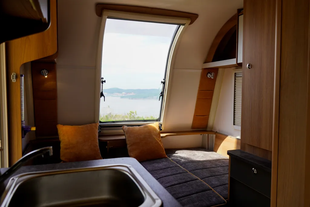 Наш прицеп — это английский автодом от производителя Бэйли, предназначен для размещения до четырёх человек по формуле 2+2 (спальные места шириной 130 и 115 см, длина 197 см каждое).