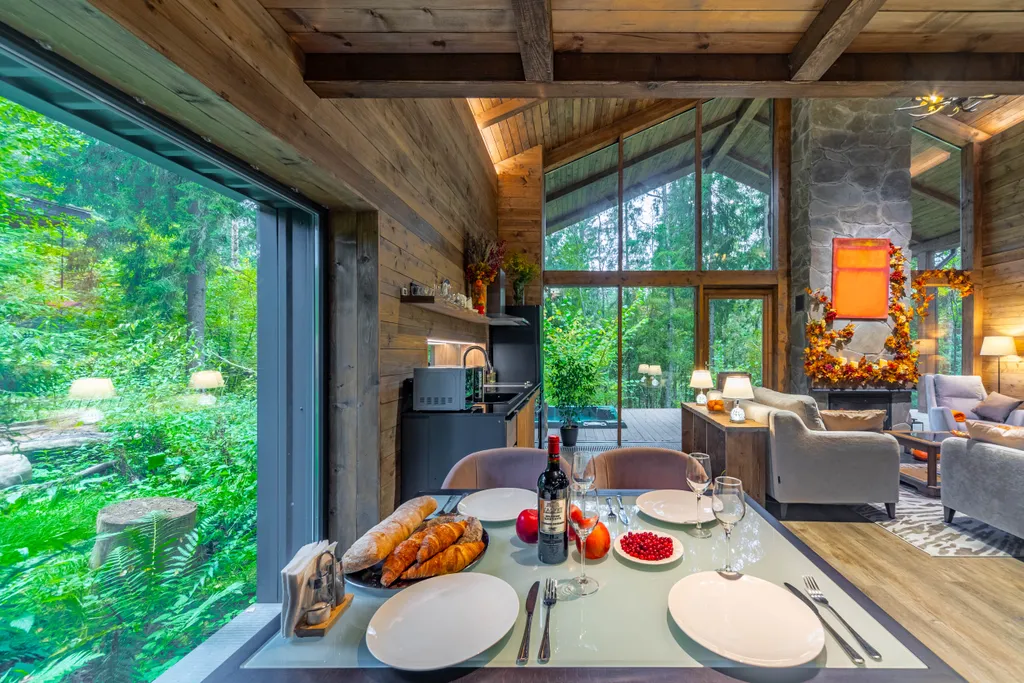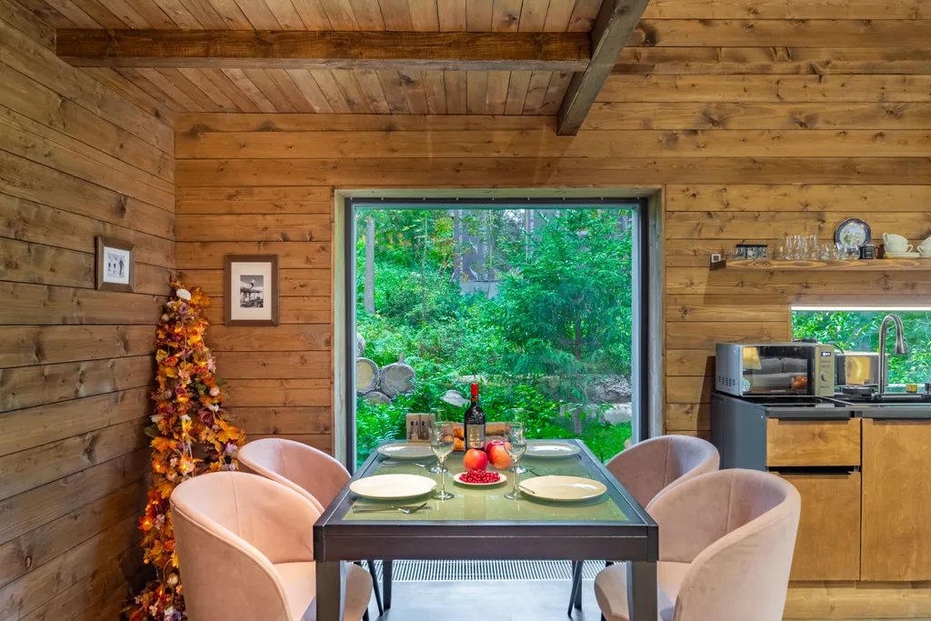 - Обеденная зона на 6 человек с видом на поляну папоротников и ели.