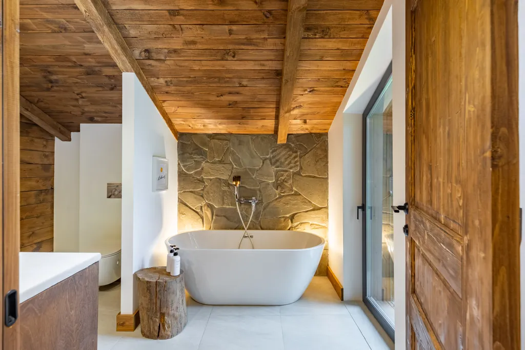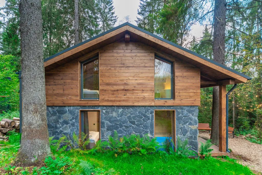 Фасад дома выполнен из натурального камня и дерева, а панорамные окна добавляют лёгкости и света. В интерьере — сочетание современного минимализма и альпийского уюта: деревянные потолки, каменные элементы, стильная мебель и продуманная детализация.