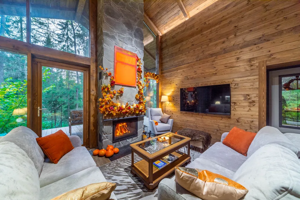 - Гостиная с камином и тв 65” — идеально подходит для просмотра фильмов, игр или вечеров у костра.