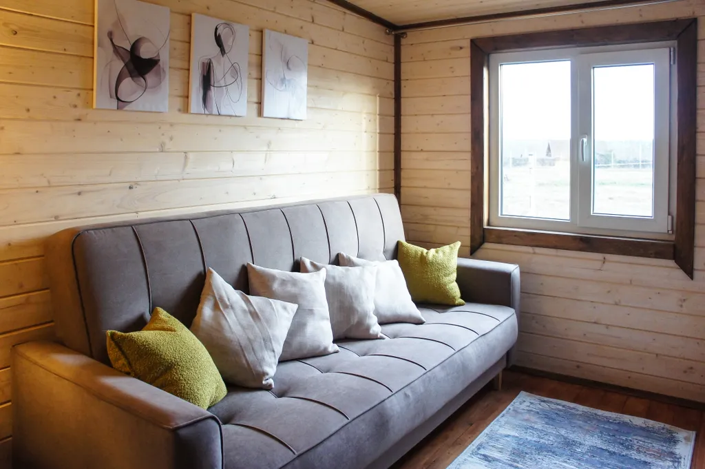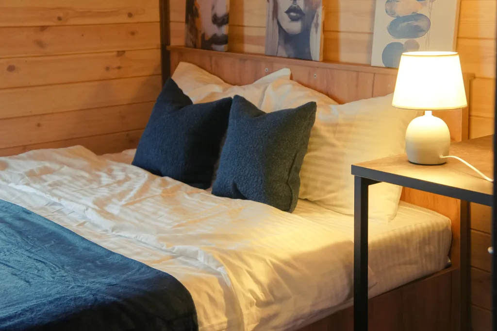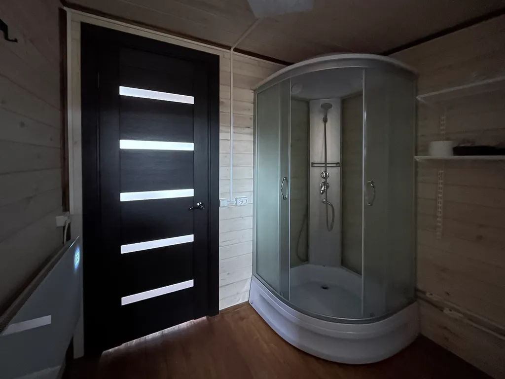 Одноэтажный коттедж располагает двумя спальнями с кроватью и раскладным диваном, гостиной с камином, баней на дровах и с/у с душевой кабиной.