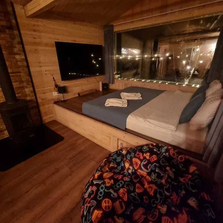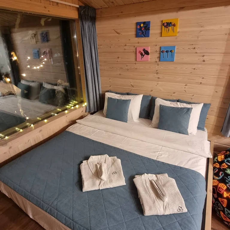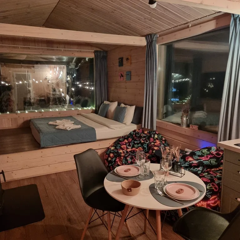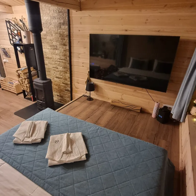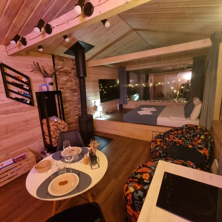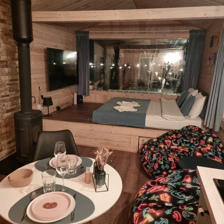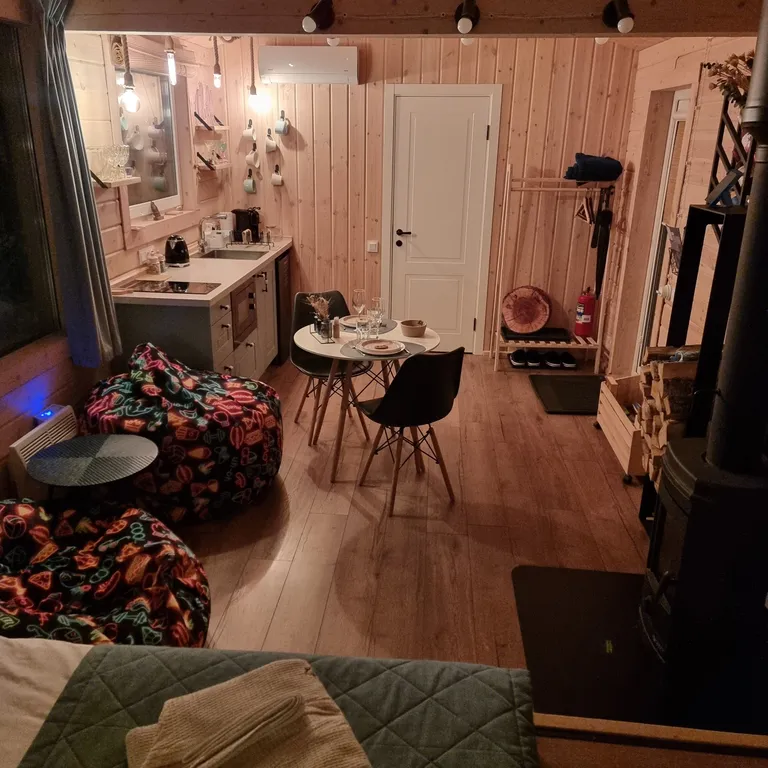 Просторная студия с панорамными окнами на природу, камином, дровницей, большим Smart TV (LG 65"), станцией Алиса Max и всем необходимым оборудованием для приготовления вкусных блюд (холодильник, варочная панель, микроволновка, чайник, кофемашина и кухонная утварь от венчика до сковородки).
