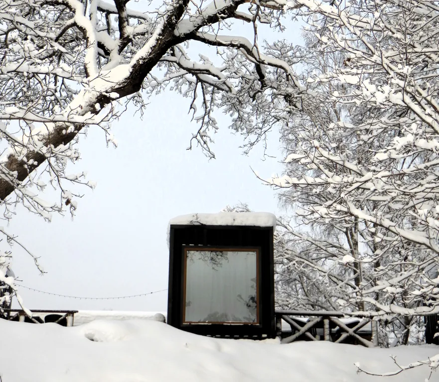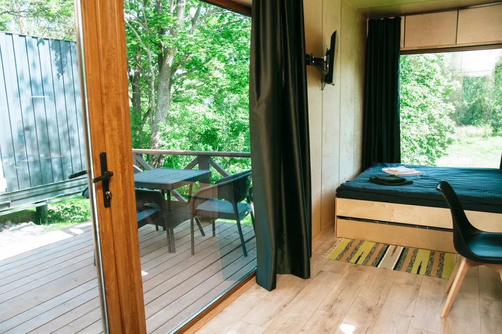 Уютный домик с панорамными окнами и открытой террасой, где можно расслабиться и насладиться тишиной и красотой природы.