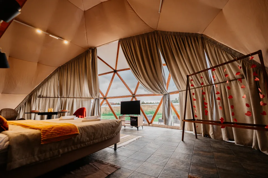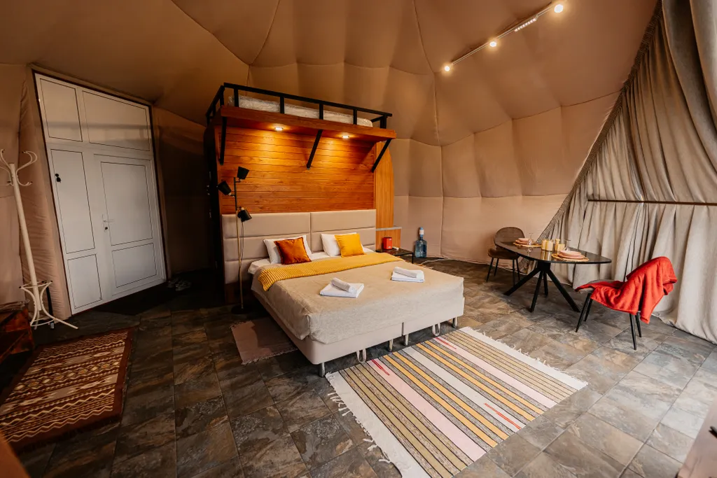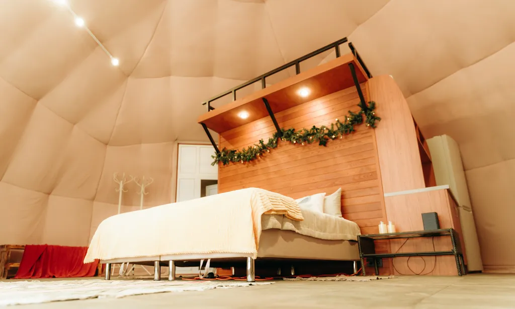В домике располагается мини-кухня, обеденная группа, спальня и санузел.