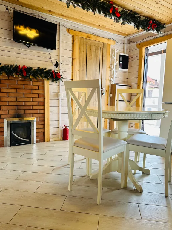 - Гостиная, оснащенная всем необходимым для готовки и сервировки, круглый стол, регулируемый по размеру