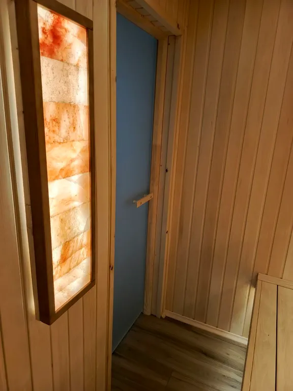 Сухая финская сауна на 7 посадочных мест с регулируемым температурным режимом и возможностью запуска в удобное для Вас время.