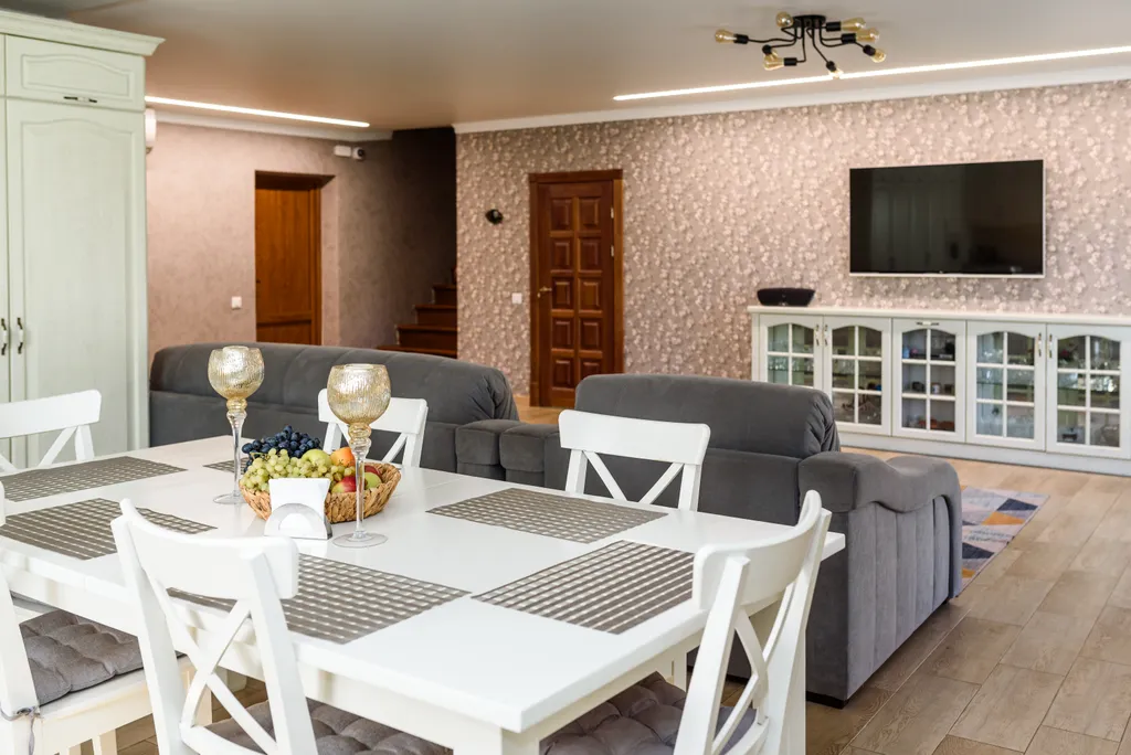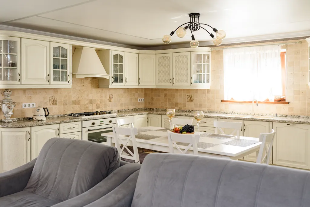 1. Просторная кухня-гостиная, есть техника (посудомоечная машина, плита с духовкой, холодильник, капсульная кофемашина, турка, большой телевизор, свч-печь, чайник), посуда для приготовления и приема пищи.