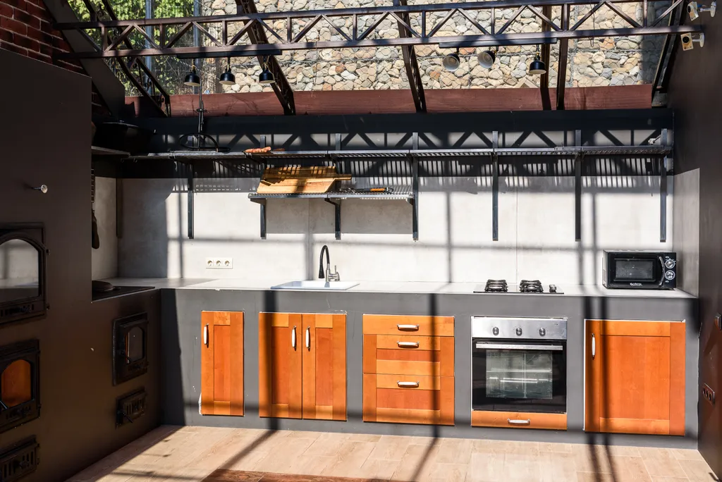 1. Летняя кухня с большой верандой, включающая зону барбекю, казан на дровах, русскую печь.