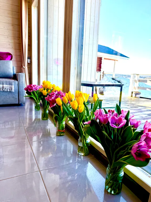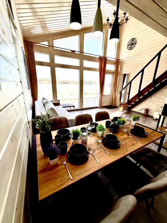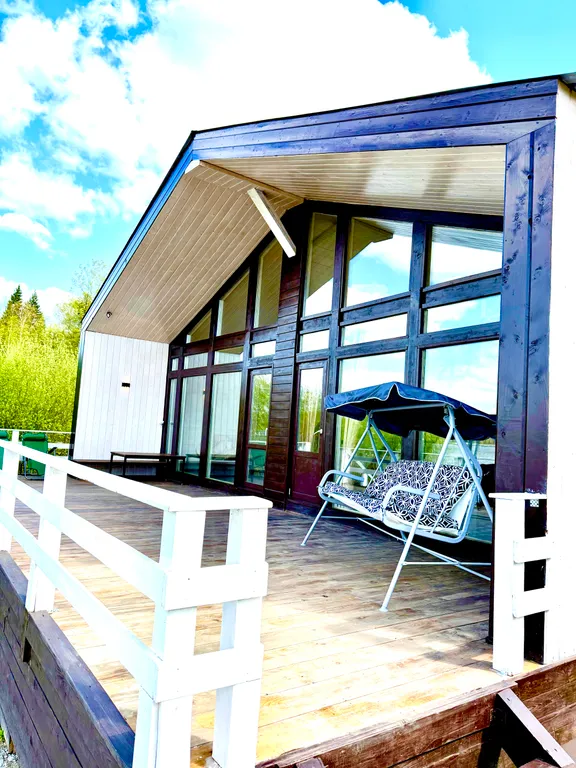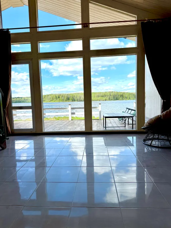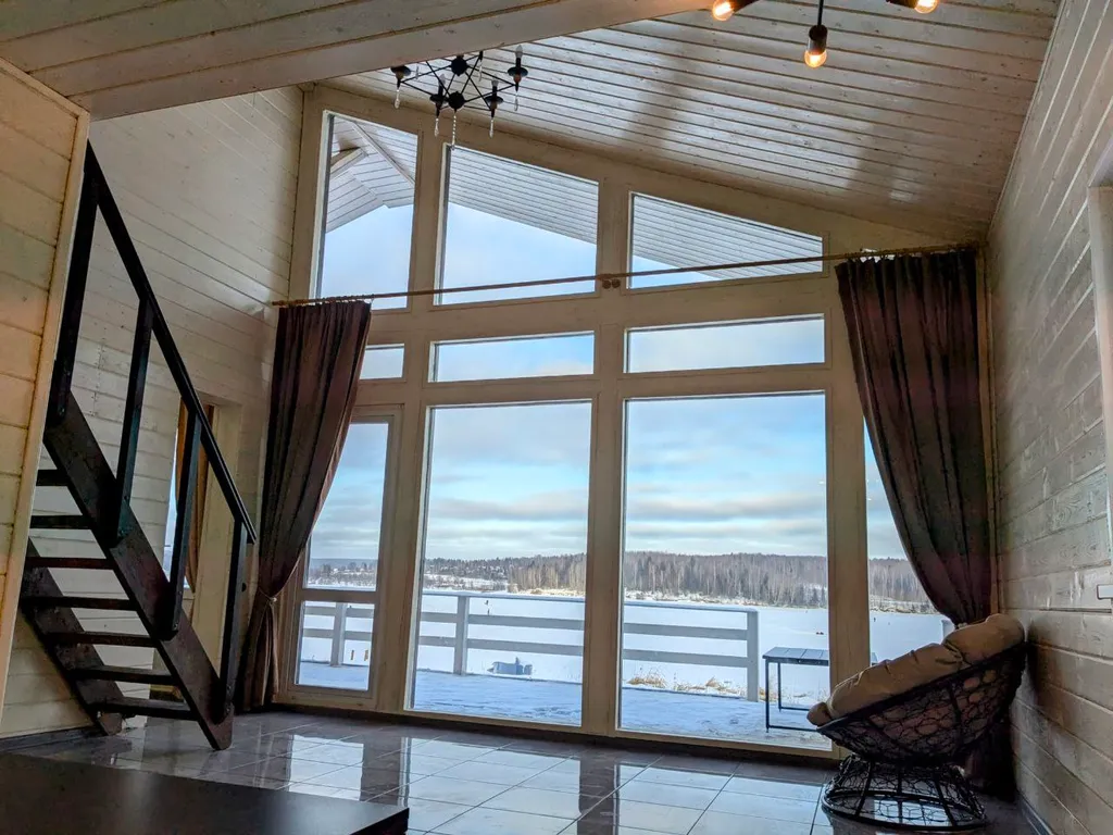 В доме. Панорамное остекление. 10-м шириной. 5, 5 м высотой. Очень красивый вид. На реку. Безумно красивый