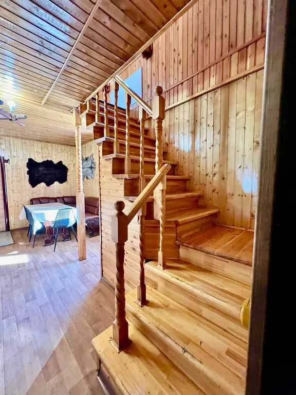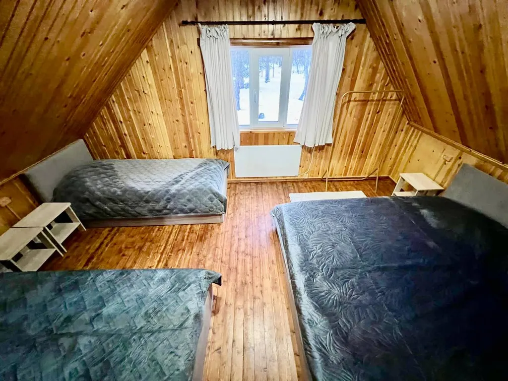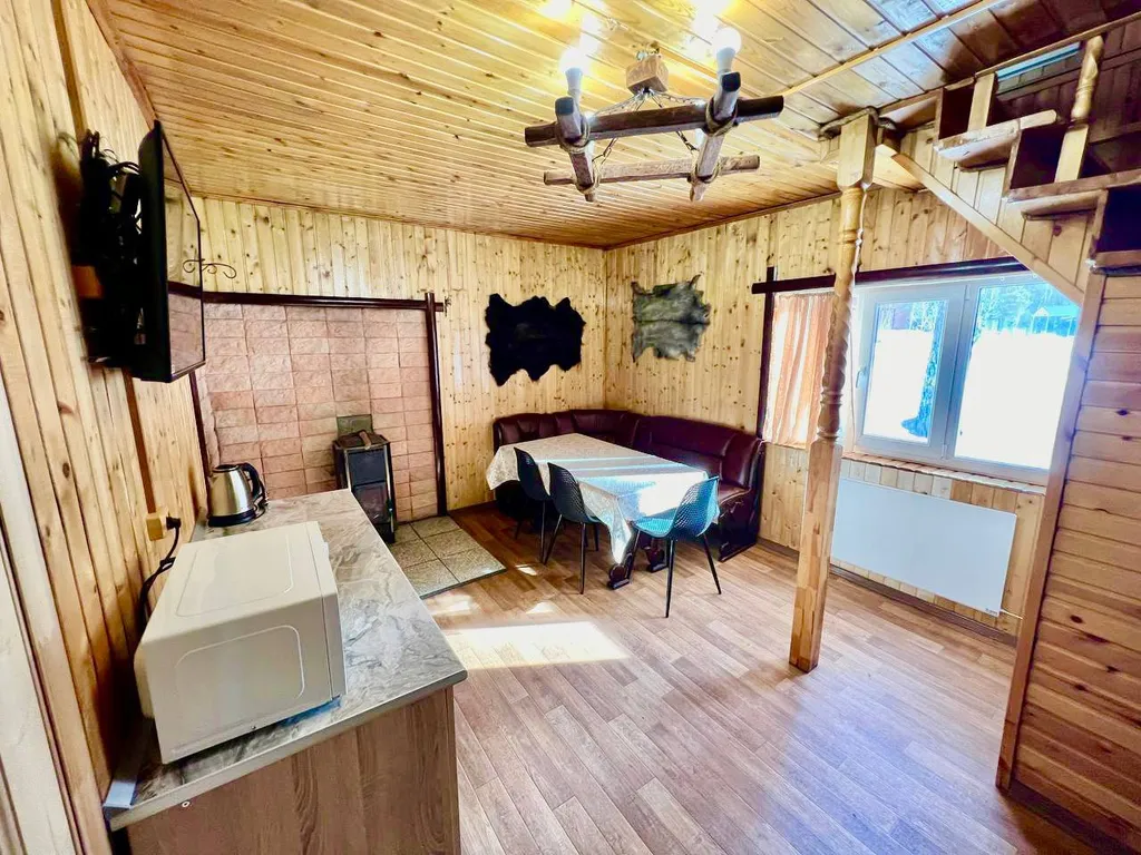 В эко-доме на 1-ом этаже гостиная/кухня, баня и с/у, а на 2-ом этаже 2 спальни (1 из которых проходная).