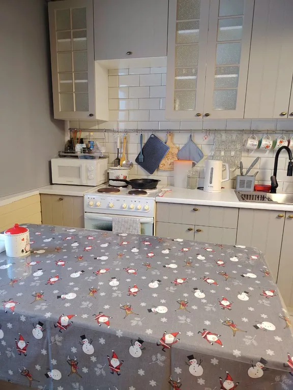 Полностью оборудованная современная кухня: плита, духовой шкаф, СВЧ, холодильник, электрочайник, вся необходимая посуда и бокалы.