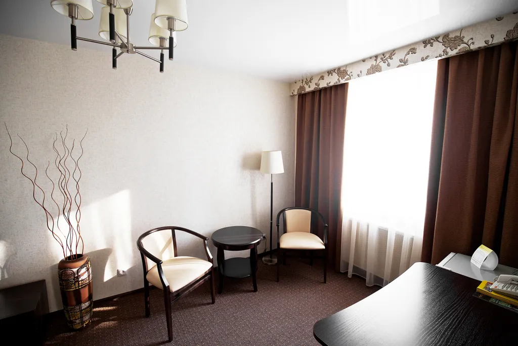 Двухкомнатный номер с балконом. В номере шкаф, рабочее место, диван-кровать, холодильник, телевизор. Большая (160х200) двуспальная кровать в спальной комнате. Общая гостиная. Сан. Узел в номере. В стоимость номера включен завтрак.