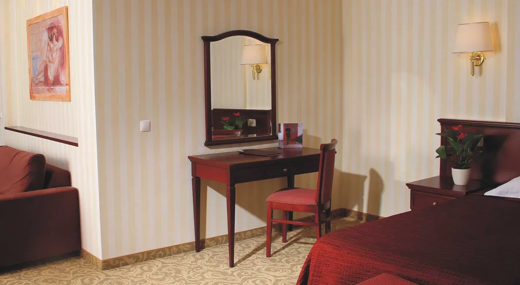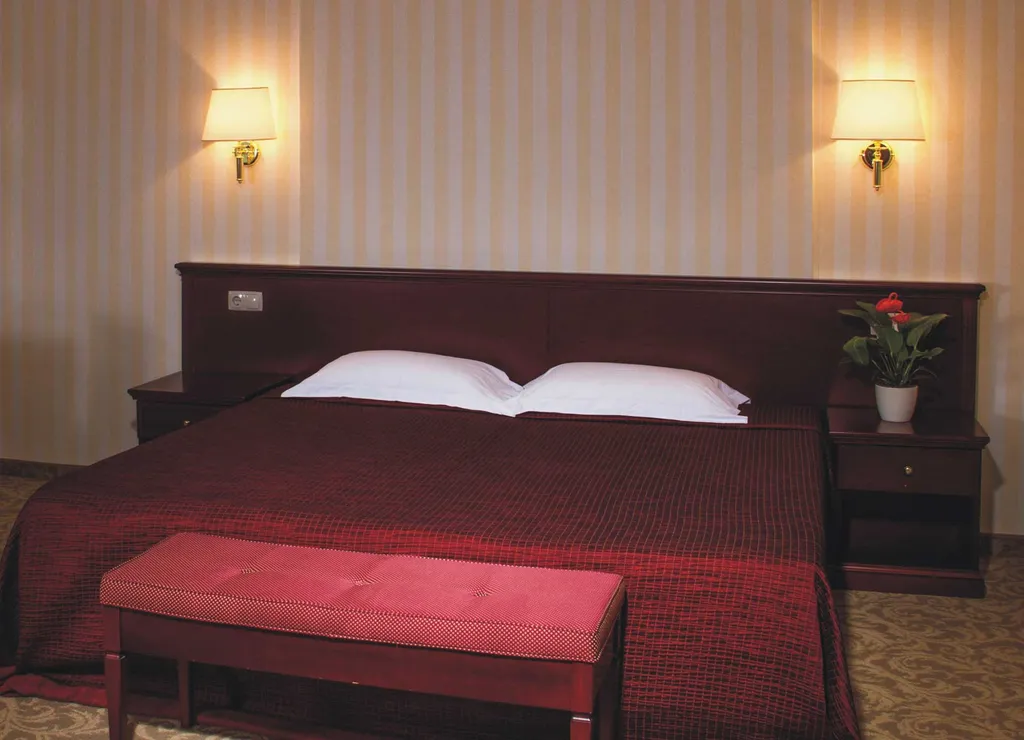 В номере кровати с ортопедическим матрасом, антиаллергенные подушки, просторная ванная, махровые халаты и прочие многочисленные принадлежности.