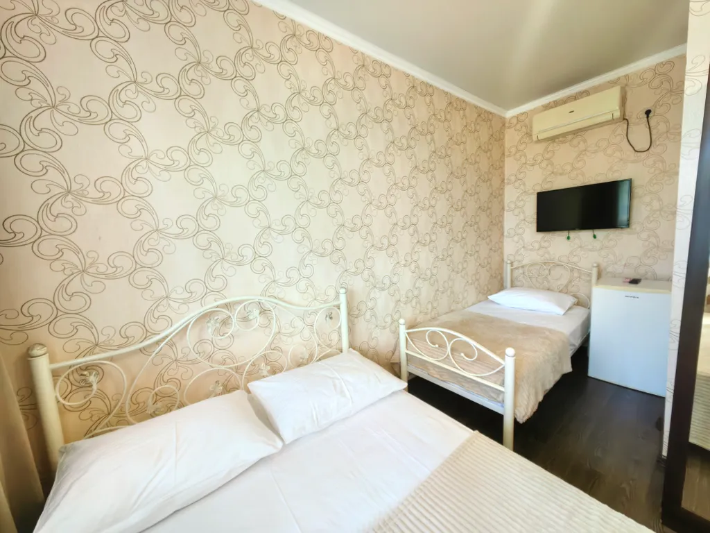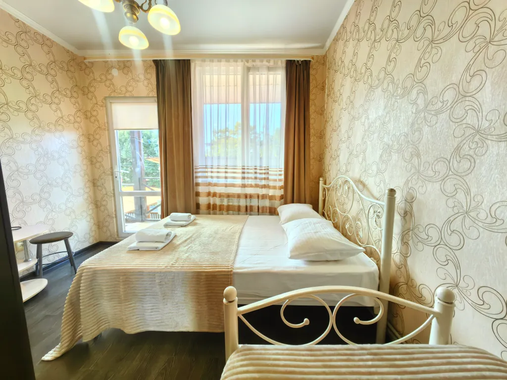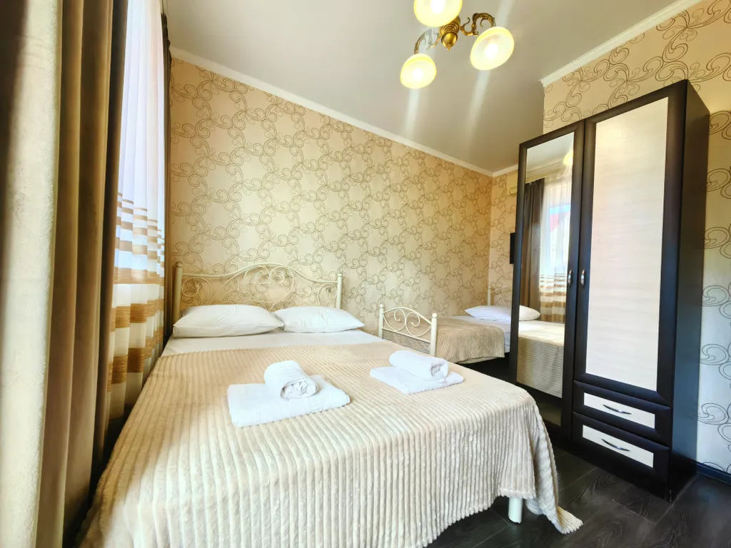 Умный комфорт: личный санузел в номере, компактный стол для семейных советов и просторный деревянный шкаф.