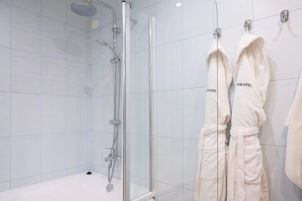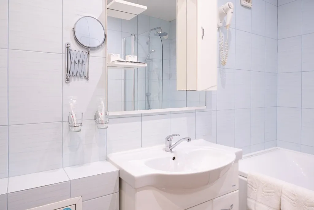 — санузел 1: ванна, раковина, туалет, стиральная машина, фен, косметический набор, халат, тапочки.