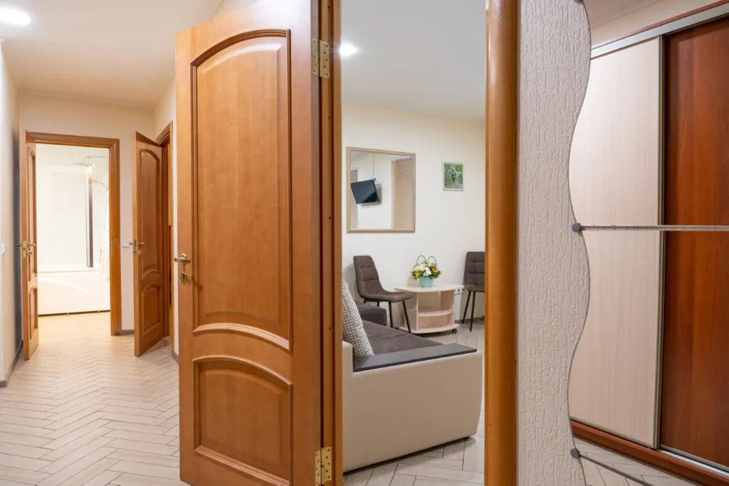 Апартаменты расположены на 1 этаже 5-этажного дома и имеют отдельный вход. Окна выходят в тихий ухоженный дворик.