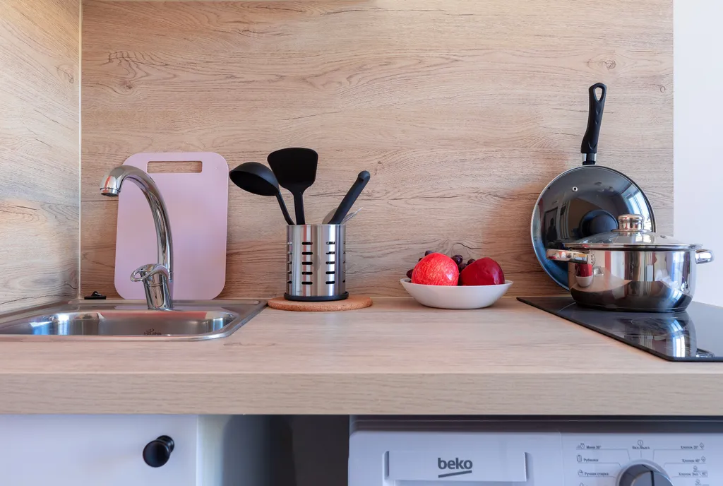 Кухонная зона с посудой, принадлежностями для готовки и необходимой техникой: электроплита, чайник, холодильник