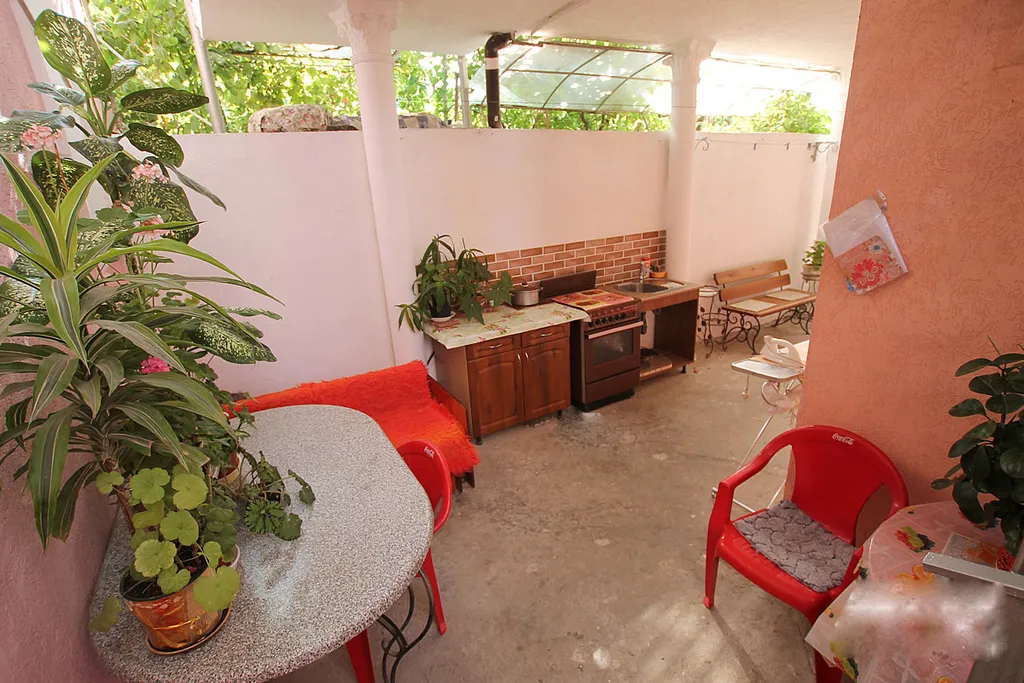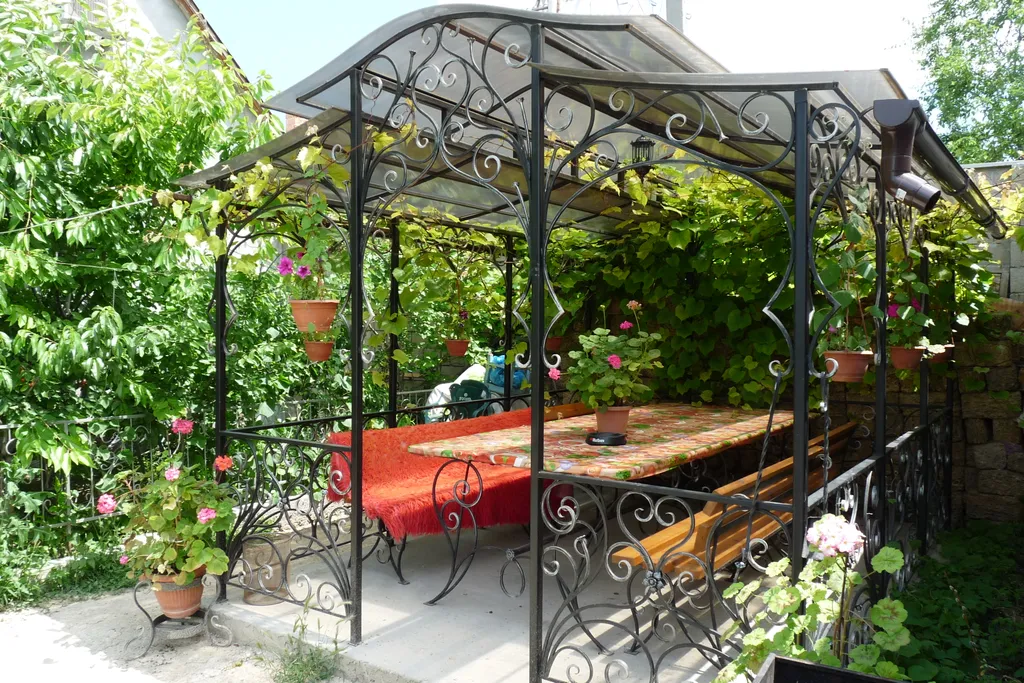 Территория. В распоряжении гостей уютный тенистый двор с розами. Под навесом расположены комфортные столики и диванчики. Имеется красивая кованая беседка под виноградником. Мангал, парковка.