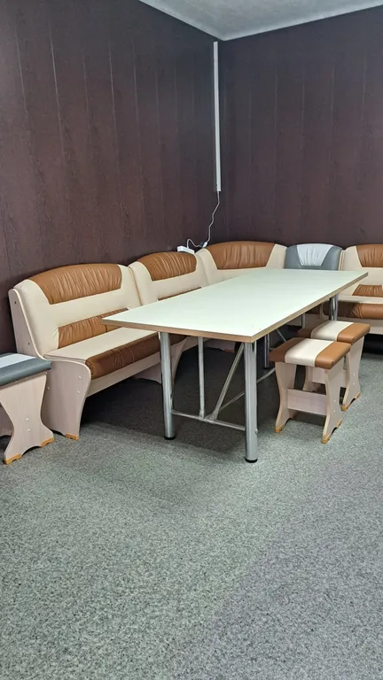 Кухня-гостиная: кухонный гарнитур, посуда, холодильник, микроволновая печь, стол, стулья, диван, музыкальная колонка, телевизор, цветомузыка.