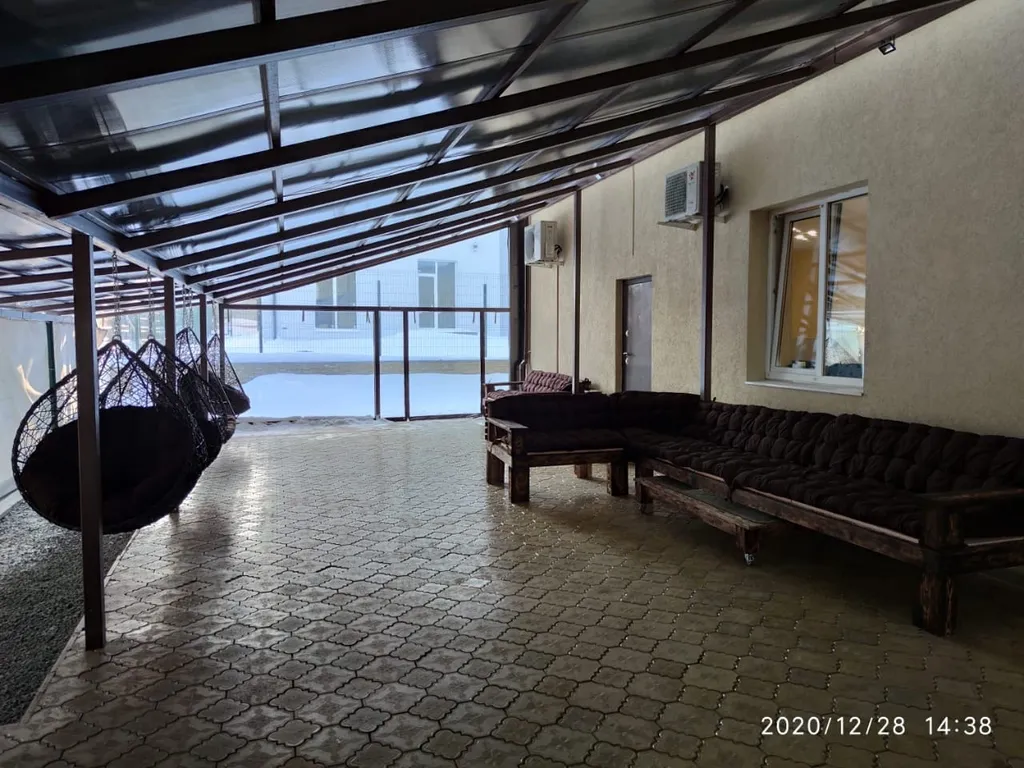 Имеется большая закрытая мангальная зона и (тандыр 500 руб) с летней кухней, а также мягкая зона с диванами, качелями и подвесными креслами. Лавки трансформируются в столы! В летнее время до 25 человек.