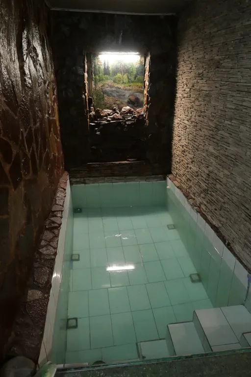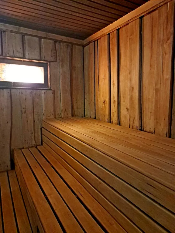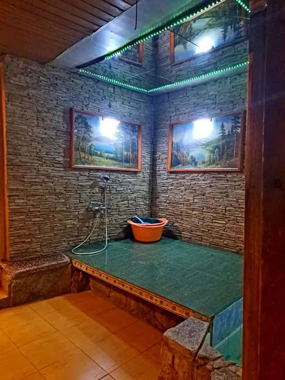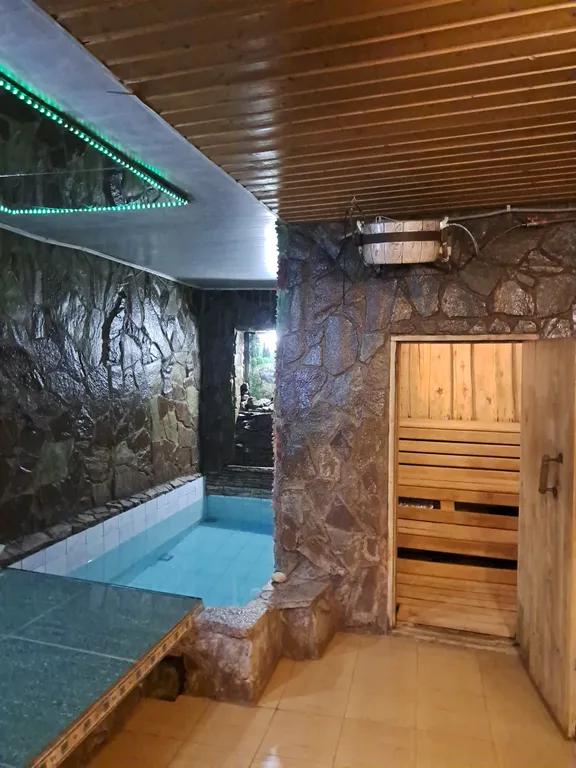 Баня на дровах с вениками и купелью (вода 22 градуса), которая расположена в центре дома, там же находится тёплая мраморная плита для спа-процедур и 2 душа!