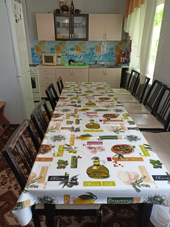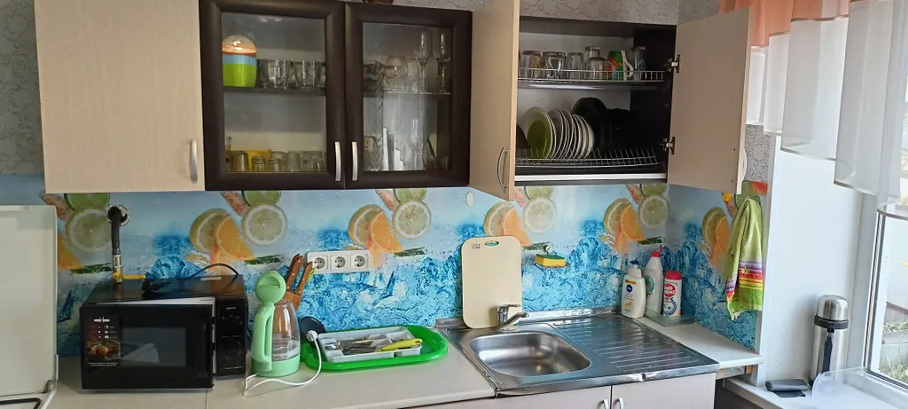 Кухонная зона (холодильник, газовая плита, эл/чайник, духовой шкаф, микроволновка, всевозможная посуда).