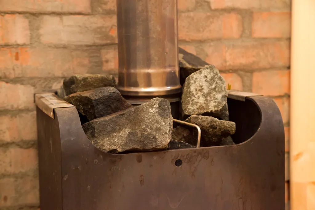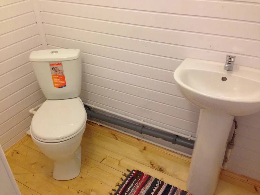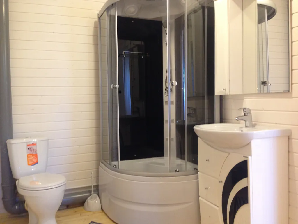 На первом этаже гостиная-кухня (20 кв. м.) с угловым диваном, а также с камином на дровах. Есть вся необходимая посуда, плита, холодильник и микроволновка. Также на первом этаже находится санузел с душевой кабиной и сауна-парилка на дровах.