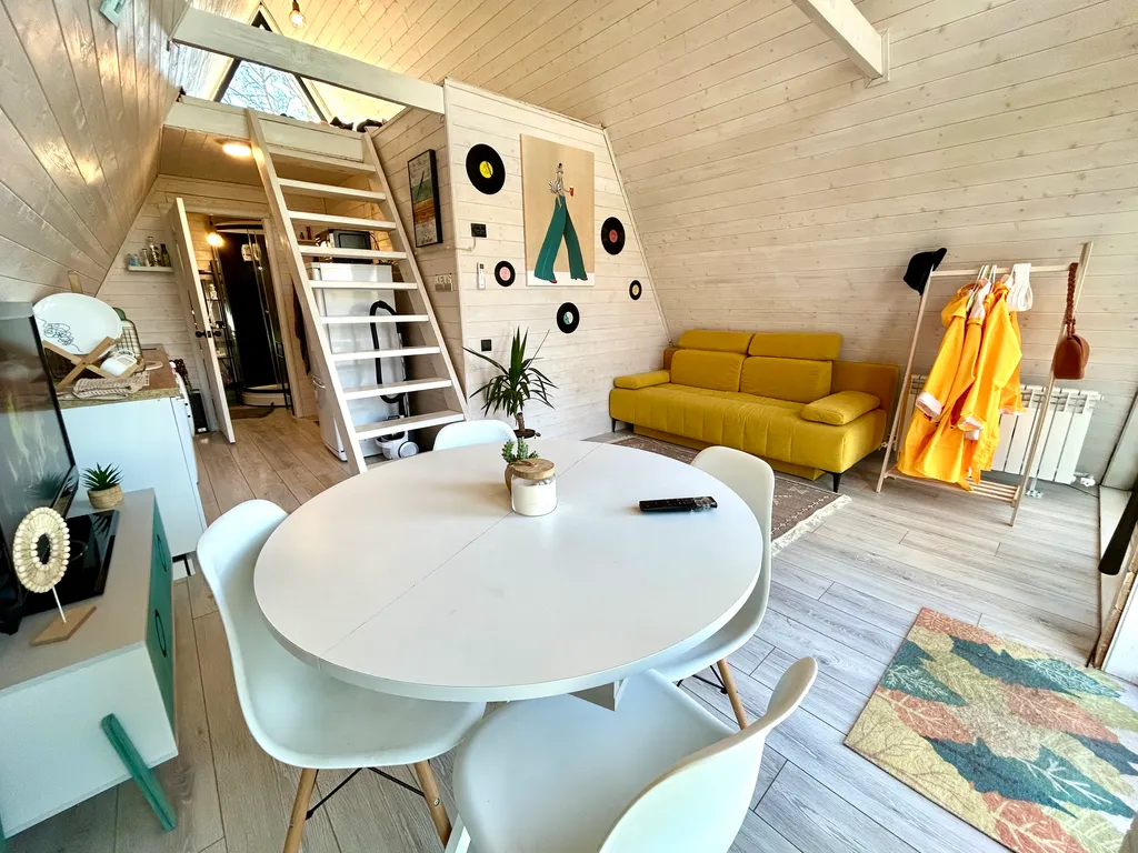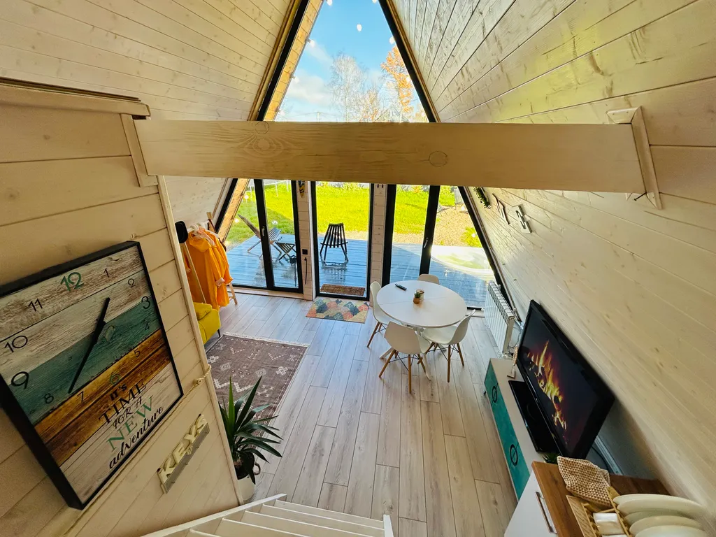 1‑й этаж дома: Обеденная зона у большого панорамного окна; - просторная кухня со всем необходимым инвентарём: - посуда, бокалы, столовые приборы; - чайник, плита, микроволновая печь, холодильник с морозильной камерой; - кастрюли, сковородки, полный комплект шампуров и решётка для шашлыка; - кондиционер; - зона отдыха со спальным местом рядом с панорамным окном; - уютный раскладной двуспальный диван; - телевизор с приставкой (Okko IVI ) Xbox, настольные игры для семейного вечера; - душевая кабина с горячим душем (напор воды стабильный); - туалет; - раковина с зеркалом; - место для сушки белья; - фен; - одноразовые гигиенические принадлежности (щётки, паста, шампуни, бальзам для волос); - одноразовые тапочки.