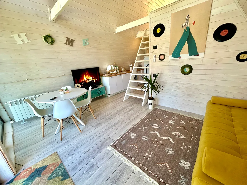 2‑й этаж: Спальная зона с большим двуспальным ортопедическим матрасом; - панорамные окна с двух сторон; - мягкий свет фонарей создаёт особую атмосферу уюта.