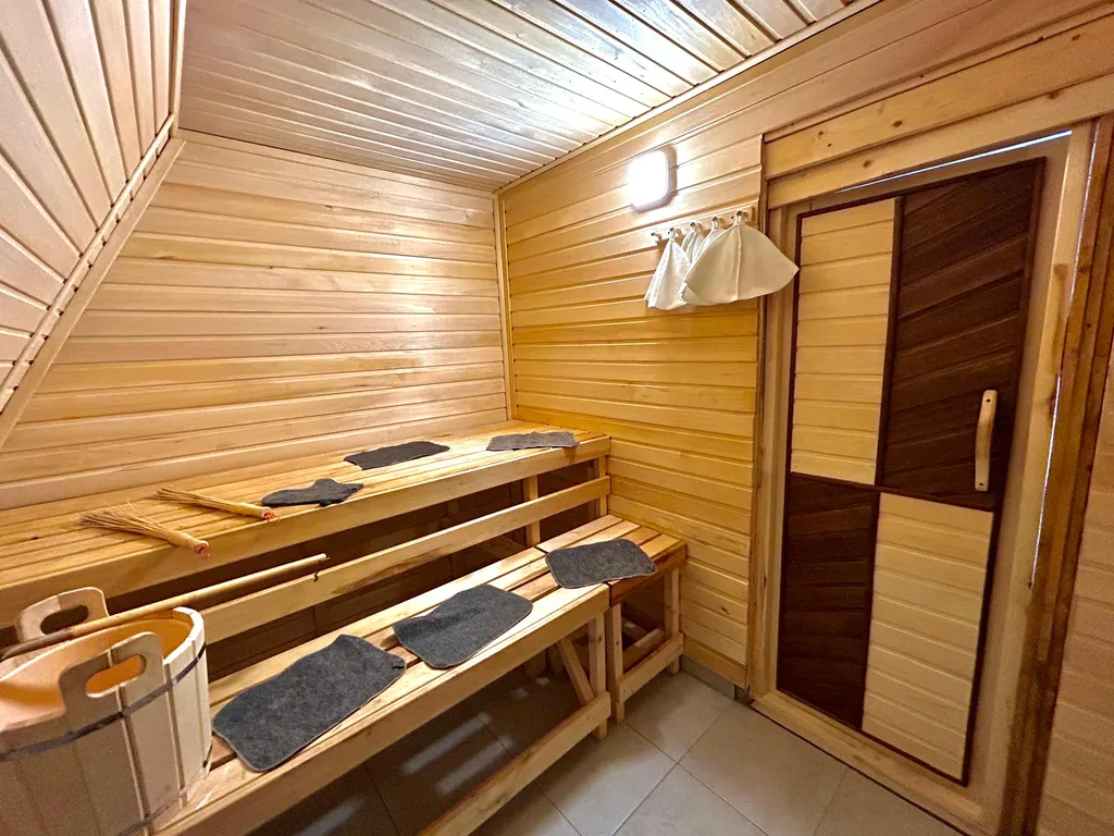 Сауна: Просторная парилка, которая понравится ценителям; - две полки для парения; - вода подаётся прямо в зону парения (не нужно носить тяжёлые ведра); - бамбуковые веники, ведро для запаривания, ковш, банные шапки, ароматизированные масла; - при оставлении отзыва в конце отдыха — сюрприз: дубовые веники в подарок.