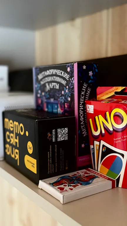 Развлечения: «Алиса», проектор, музыкальная колонка с микрофоном, настольные игры, книги, доски садху, тибетская поющая чаша.