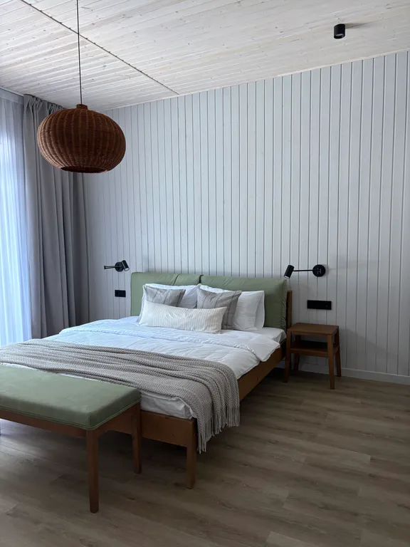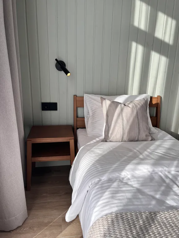 Интерьер выполнен с использованием натурального дерева, создавая тёплую и комфортную атмосферу. Река всего в 5 минутах ходьбы, а голосовой помощник «Алиса» и доставка блюд из кафе карельской кухни обеспечат дополнительное удобство.