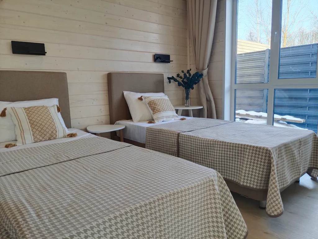 3 спальни c двуспальными крoвaтями (2 — 160×200, 1 — 2 кровати 90×200 при необходимости сдвигаются)