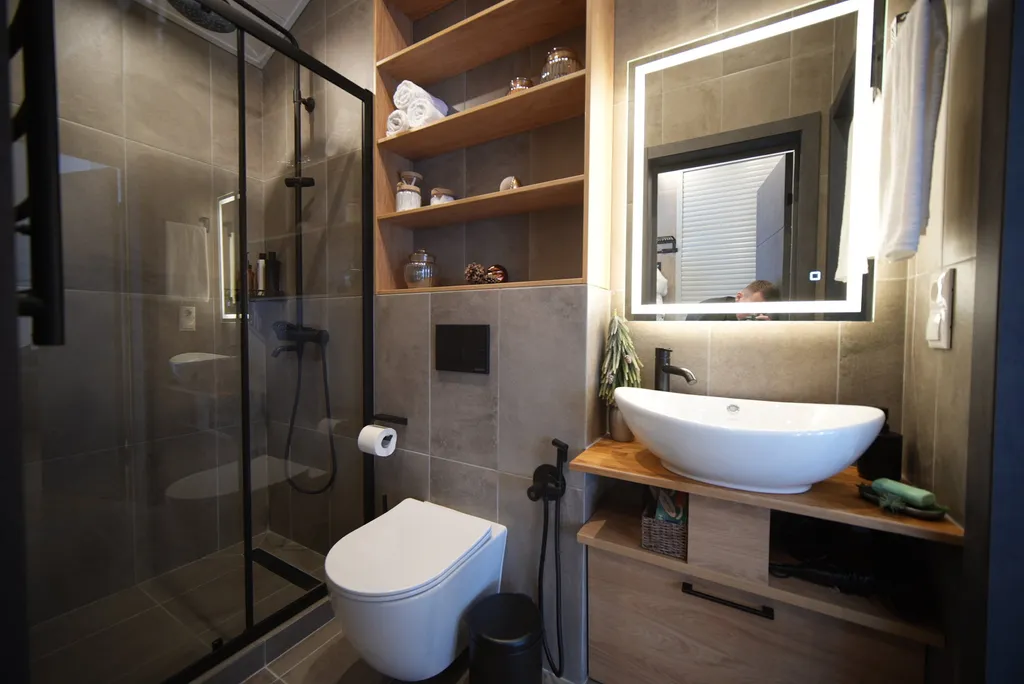 Просторная гостиная с двухместным диваном и барной стойкой, обеденным столом на 6 персон, кухня со всей необходимой современной техникой и посудой, санузел с душевой.