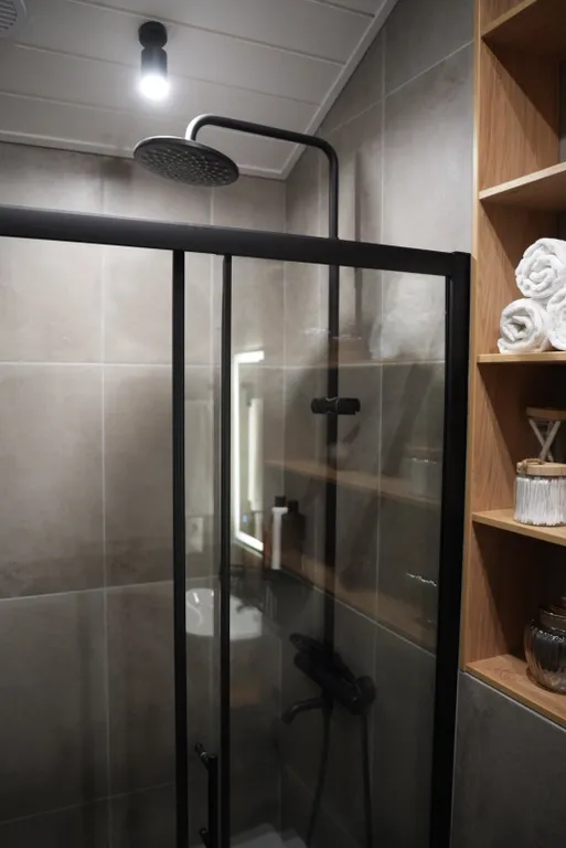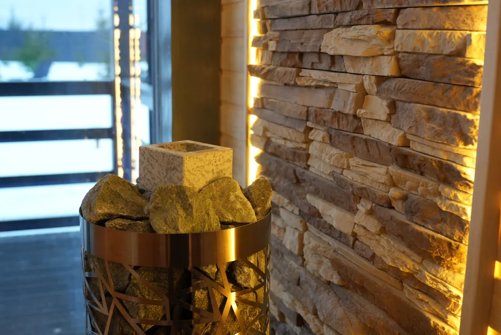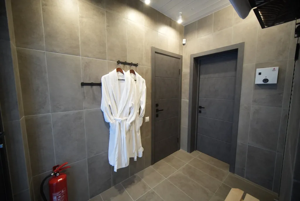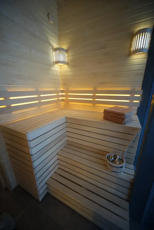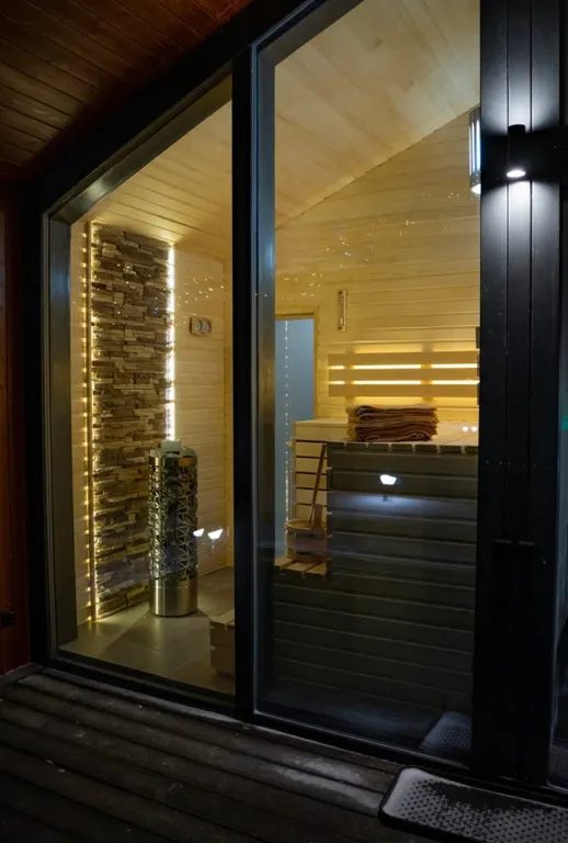 Сауна оборудована музыкальной системой на пульте управления. Специальная душевая с обливной системой, а также из зоны сауны предусмотрен отдельный выход во двор. Парилка с красивой подсветкой и панорамными окнами во двор.