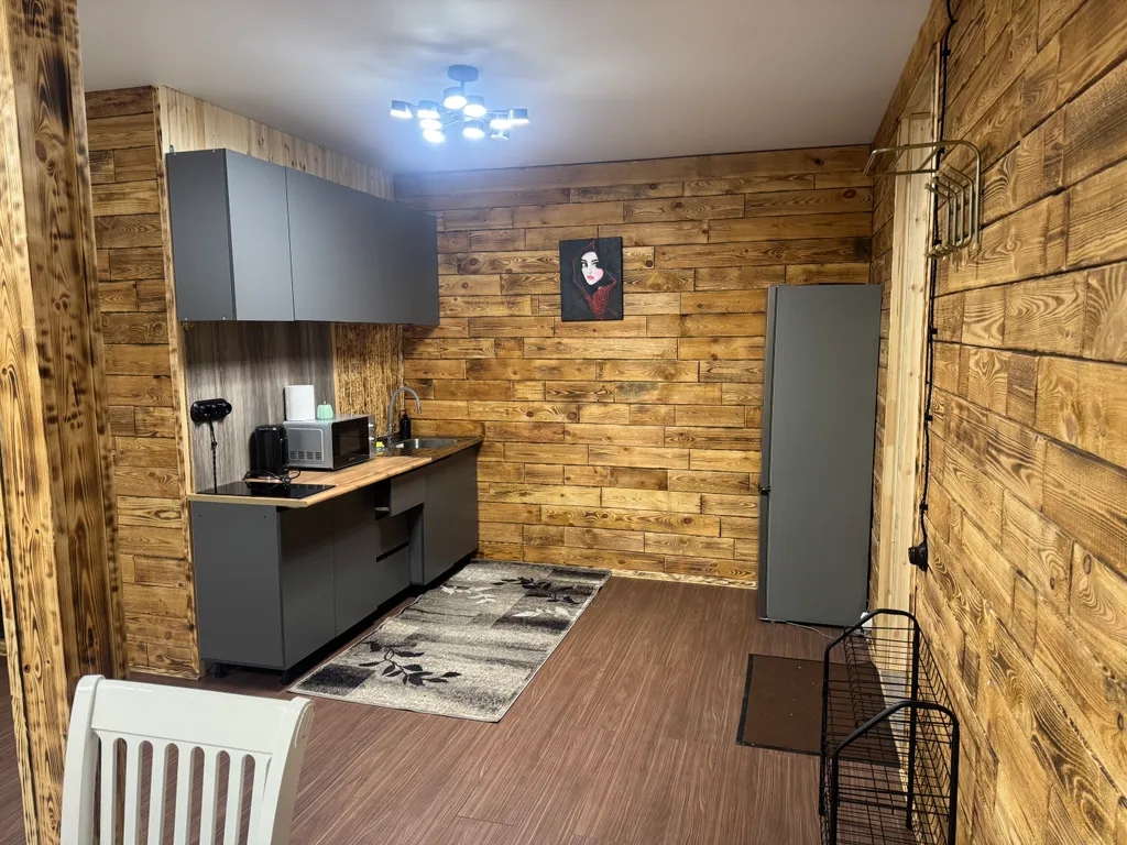 Кухня оснащена всем необходимым: холодильник, электрическая плита, микроволновая печь, электрический чайник, посуда для приготовления. По запросу предоставляются шампура и сетка для жарки мяса. Возле дома располагается собственная мангальная зона.