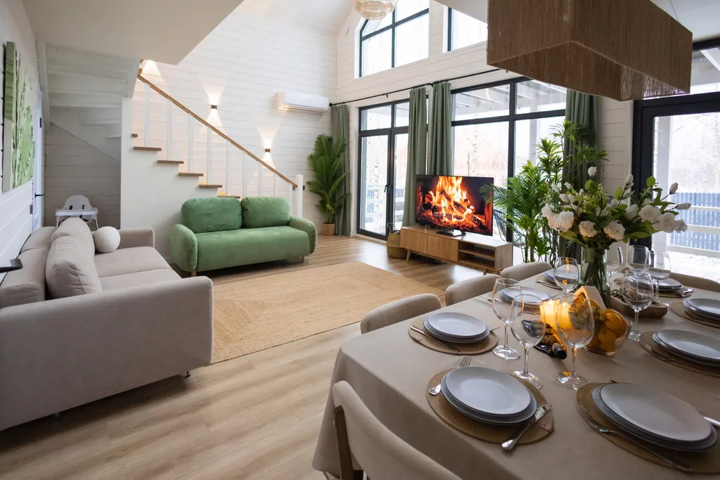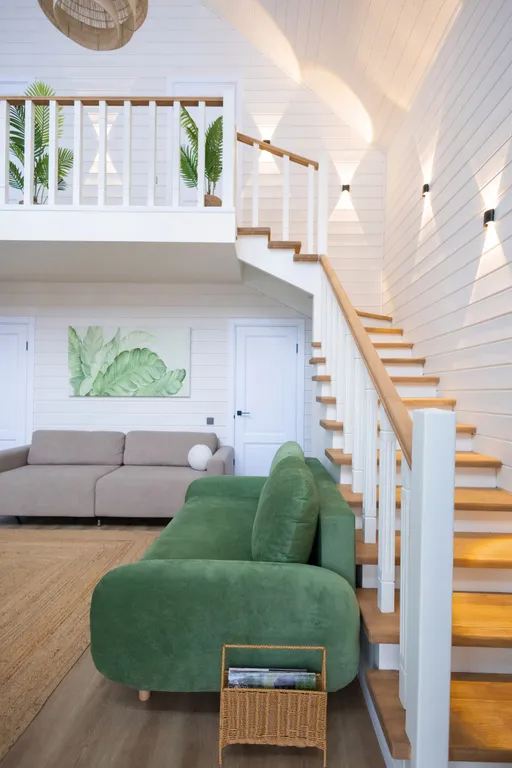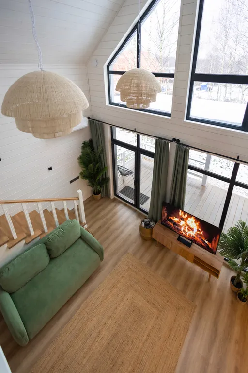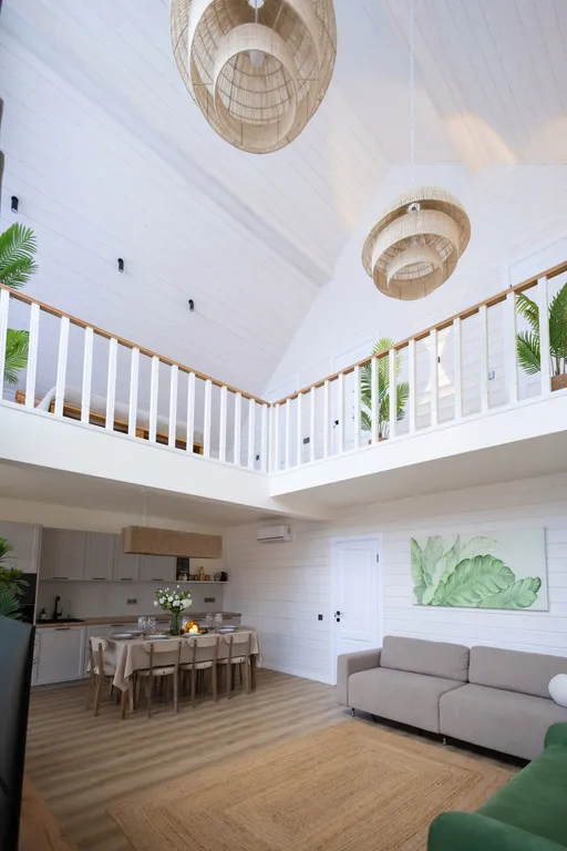 - Гостиная совмещена с кухней. В зоне второго света потолки достигают 7,5 м, что дает хорошую акустику и идеально подходит для ретритов, всевозможных практик от йоги до поющих чаш. Женские круги, девичники/мальчишники, дни рождения - мы рады спокойным не шумным компаниям, которые привыкли отдыхать культурно.