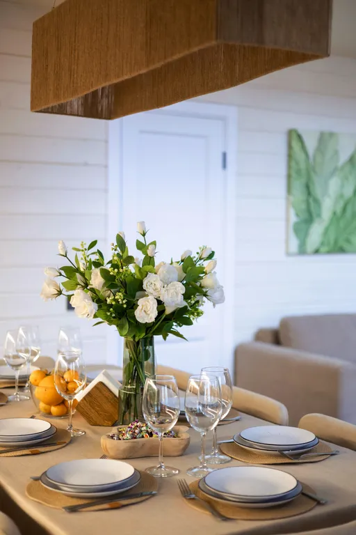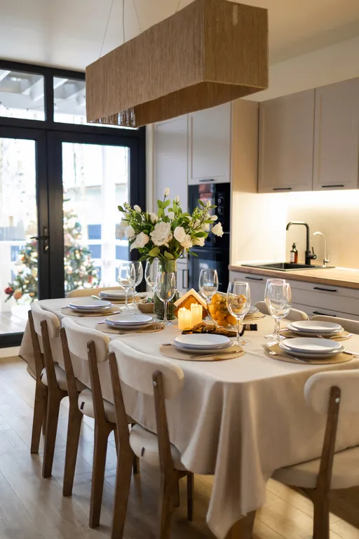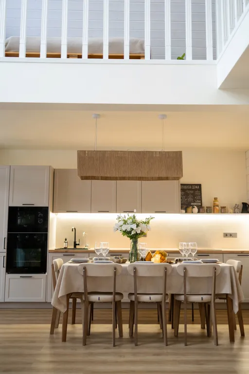 - Стол в кухонной зоне раздвигается, за него спокойно помещаются 12 человек с красивыми стульями.
