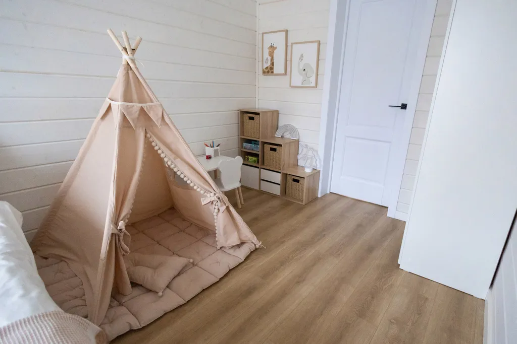 - В детской зоне есть стол и стульчик, вигвам и стеллаж с игрушками для наших маленьких гостей.
