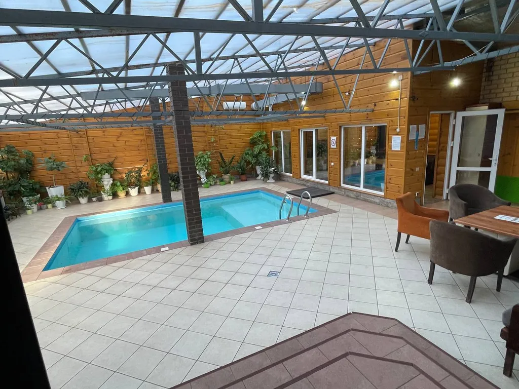 Парилка с веником, большой теплый бассейн, уютная комната отдыха.